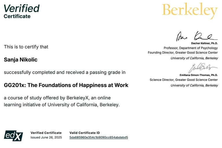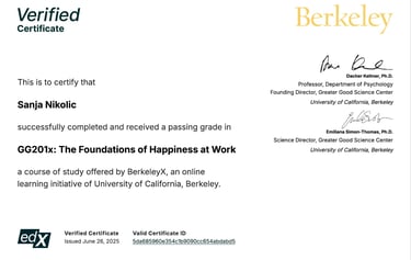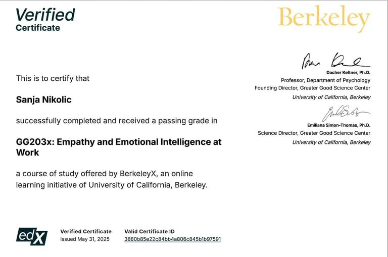 I am Sanja, a philosophy teacher, novelist, and coach. My work is shaped by my journey as a civil war survivor, which fueled my dedication to building spaces with empathy and courage. I take a multi-dimensional approach, blending UC Berkeley training in emotional intelligence, empathy, mindfulness, stress resilience, and happiness at work with my own research as a published author on emotions and trauma. I also lead a trauma healing writing program designed to help individuals process past experiences.